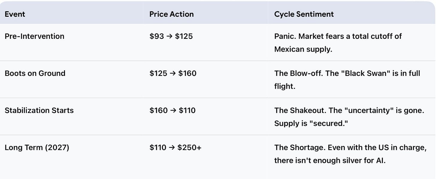 • The Pre-Intervention Frenzy (Now - March 2026): As fears of cartel disruption intensify and whispers of US intervention grow, silver will continue its vertical ascent. We anticipate a surge from current levels toward $125-$135 an ounce. The market will be pricing in a total supply cutoff.