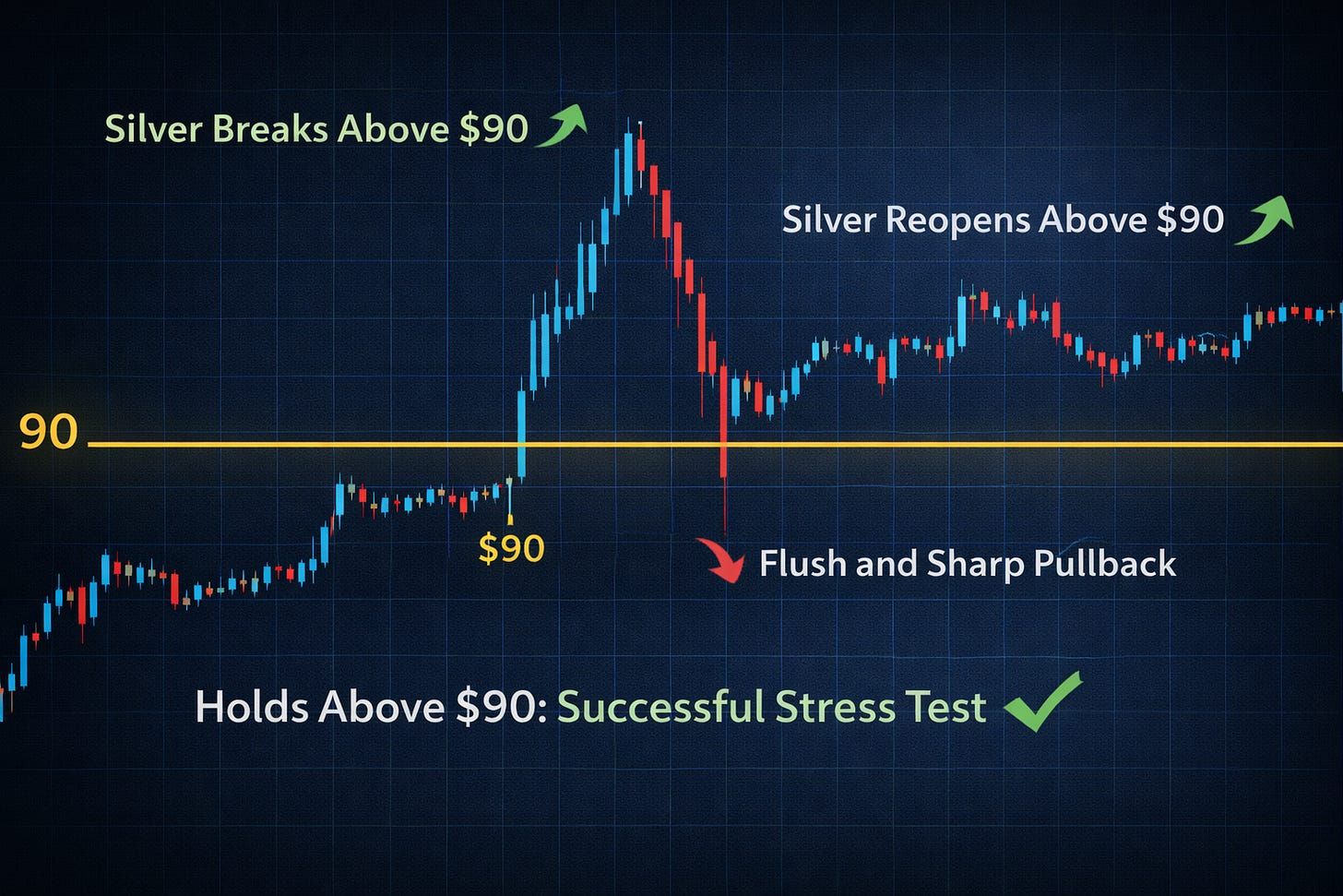 Silver surged violently through the $90 level, spiked into the low $90s, then suffered a sharp, deliberate flush. That kind of intraday violence is exactly what markets do when they are testing liquidity, probing weak hands, and forcing repositioning.